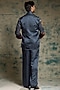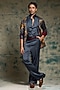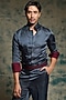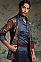Featuring a charcoal blue blazer in linen silk base with hand paint and hand embroidery. It is paired with a shirt and trousers. Perfect for festive occasions or wedding ceremonies, exuding charm and elegance.