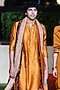 Featuring a mustard kurta in raw silk base with marodi work. It is paired with satin silk printed wide-leg trousers and a velvet hand work dushala. Style it with pair of mojaris and a watch for a traditional look, Perfect attire for a wedding or haldi ceremony.